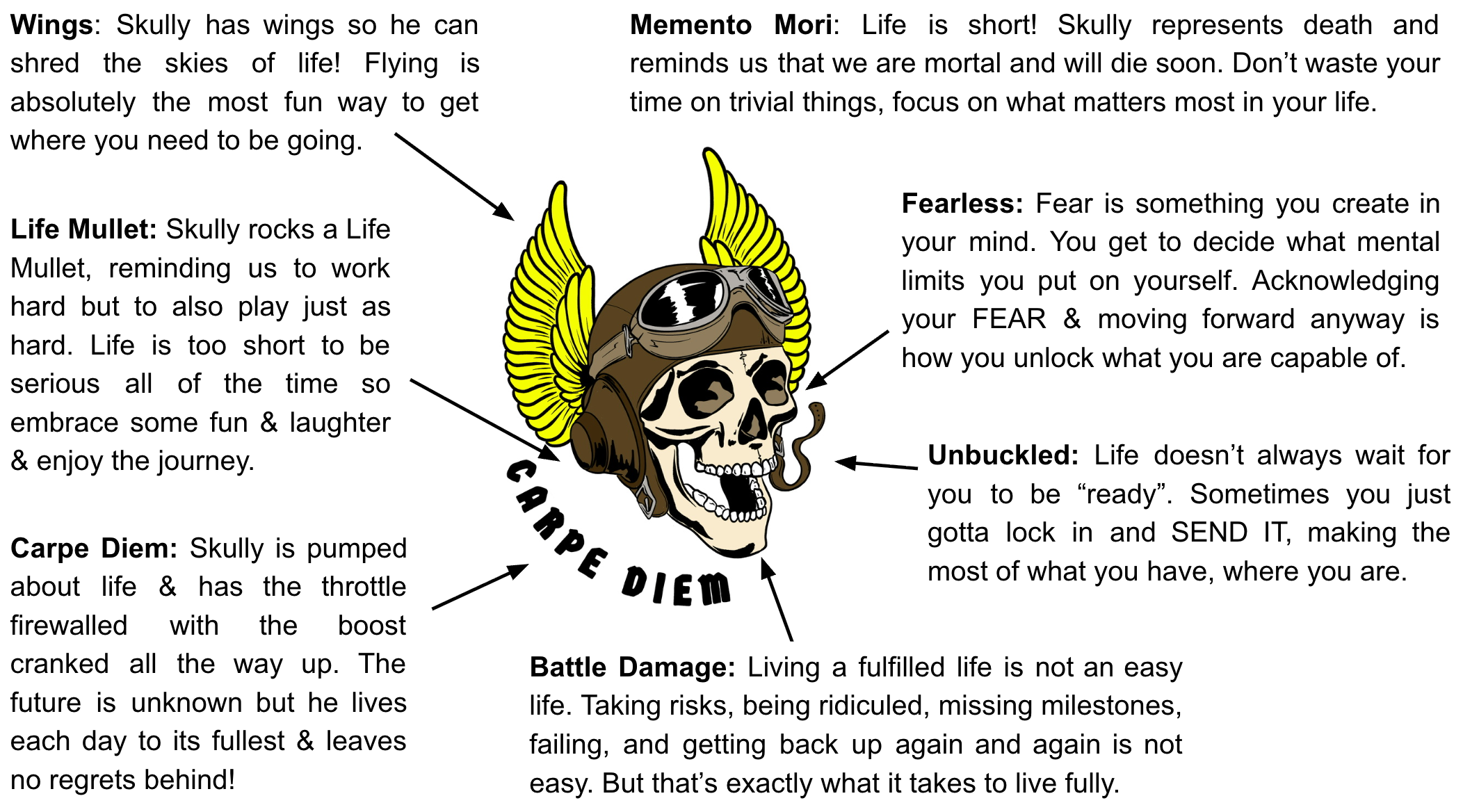 The letter “N” in NSPIR3 represents flight. For aircraft in America, the first letter in the registration starts with an “N”. Flight is efficient, effective, and absolutely the most fun way to get you where you need to go in life. “Skully” is our NSPIR3 mascot and with his aviator “skull” cap and goggles on, he reminds us that life is short so seize the day and go shred the skies of life!